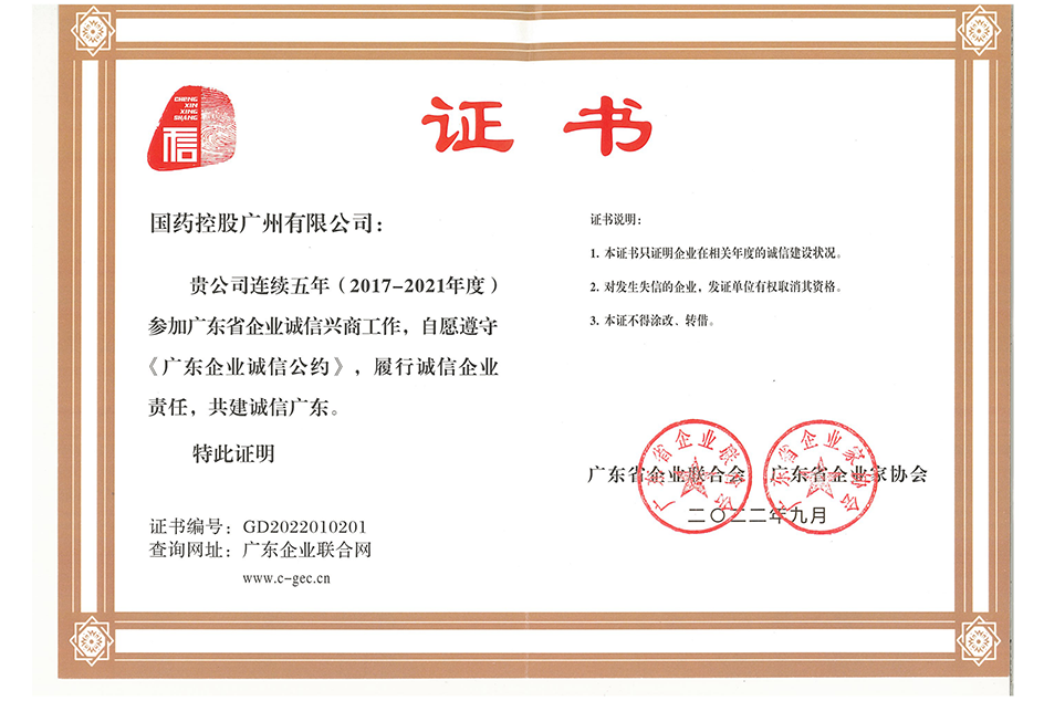 2017—2021年度廣東企業(yè)誠(chéng)信公約—證書